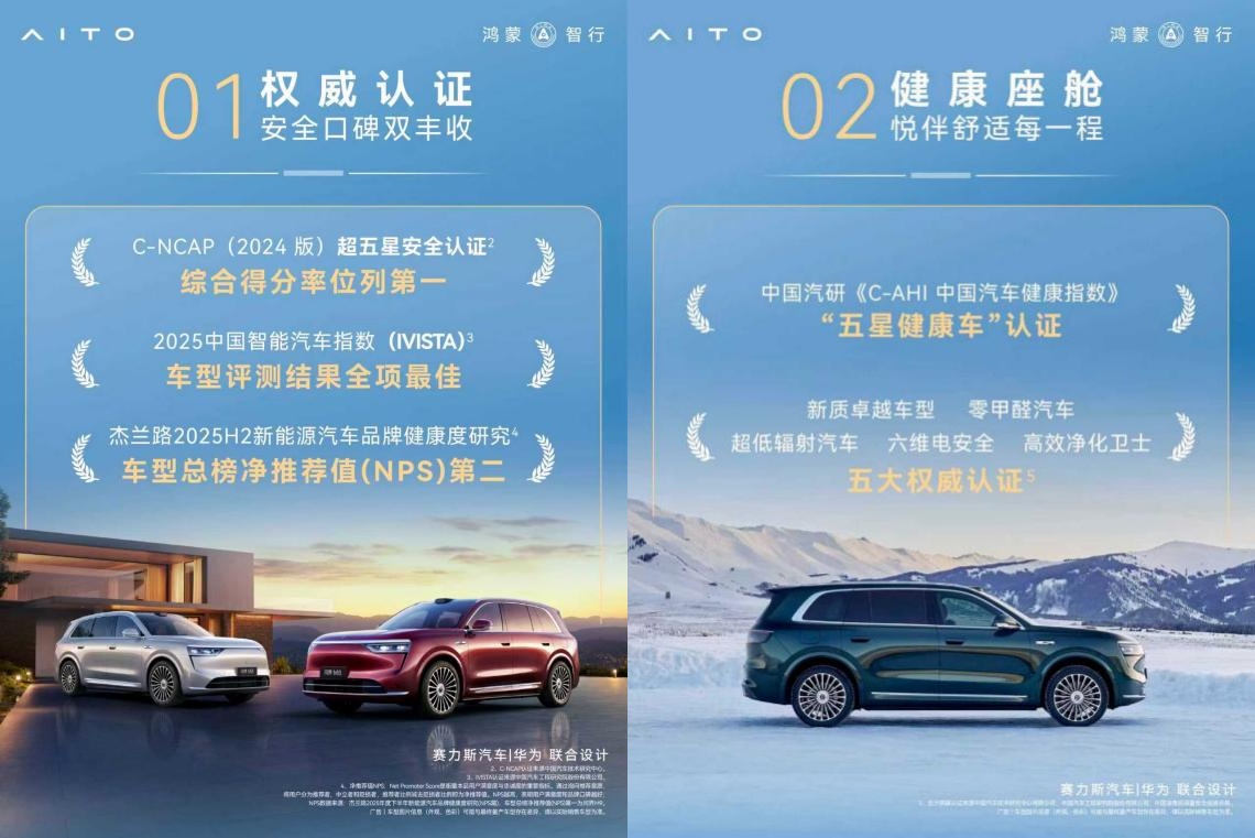 这一理念的扎实落地,获得多家权威机构的严苛认证。截至目前,问界M8已成功揽获C-NCAP(2024版)超五星安全认证、中国汽研《C-AHI中国汽车健康指数》“五星健康车”认证、CA-CAP测试“白金等级”证书等多项权威认证,覆盖产品整车安全、健康座舱、技术可靠性及综合产品力等多个维度,系统性印证了问界M8作为行业“标杆”的硬核实力。