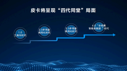 中国皮卡品类持续进化,已形成了“四代同堂”格局:1.0工具车时代,皮卡主要为货运工具,长城皮卡迪尔始终领跑;2.0多用途商用化时代,皮卡以商用为主,兼顾家用,长城风骏常年稳坐销量冠军宝座;3.0多用途乘用化时代,皮卡以多用途、乘用化为主,长城炮重新定义皮卡,激发一车多能品类本质;如今,皮卡迎来“4.0全场景智能新能源”时代,山海炮Hi4-T的推出,开启皮卡新能源元年。